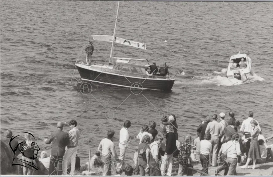båt, vatten, segel, människor, strand, 1970-tal, svartvit, fiske, aktivitet, samling, båtliv, natur, roligt, fest, sommar, kajak, sport, tradition, hav, utflykt
