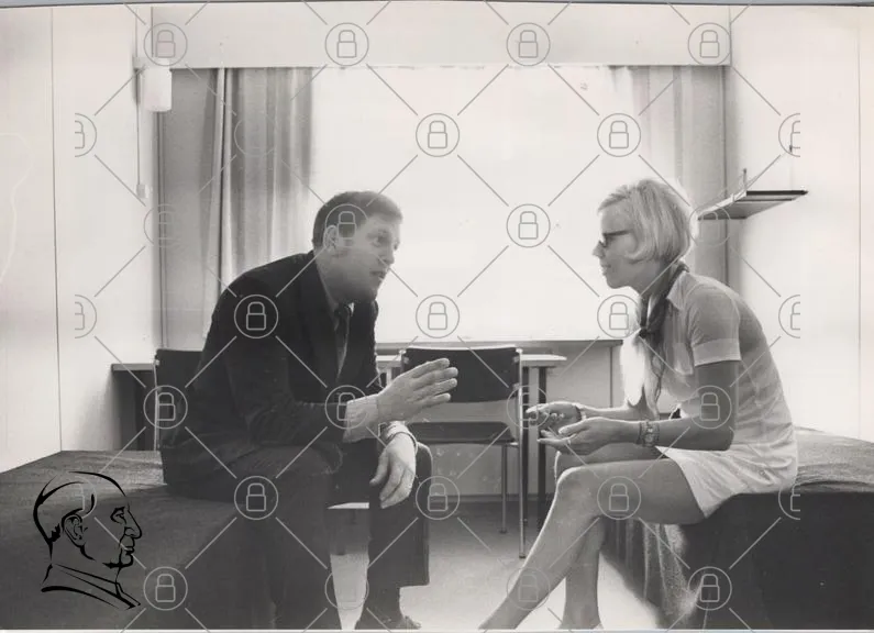 samtal, man, kvinna, kontor, svartvitt, kläder, möbler, stolar, bord, fönster, inomhus, interiör, 1960-tal, professionell, diskussion, kroppsspråk, uttryck, stil, mode, relationer