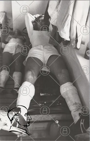 svartvit, sport, träning, vila, idrottare, ben, shorts, strumpor, kropp, avslappning, inomhus, gym, lag, svett, utrustning, handdukar, bänk, fotboll, gymnastik, motion, hälsa, fitness, aktivitet, prestation, ungdomar, man, kvinna, liggande