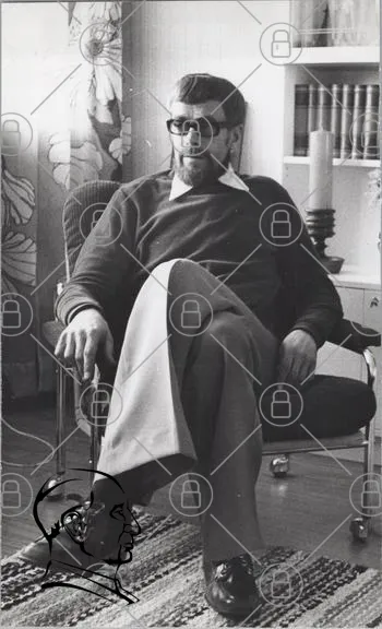 man, glasögon, fåtölj, svartvitt, inredning, stil, 1960-tal, kläder, skägg, sittande, rum, möbler, retro, avslappnad, pose, interiör, kavaj, byxor, armstöd, heminredning, elegans, tidlös, fotografi, vintage, atmosfär, detaljer, belysning, konst, kultur, personlig