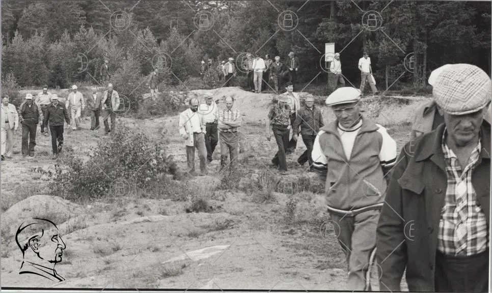 människor, skog, promenad, natur, kläder, grupp, svartvitt, landskap, träd, mark, aktivitet, utomhus, män, kvinnor, samling, 1900-tal, tradition, fritid, socialt, gemenskap, stämning, utflykt, fotografering, historisk, miljö, väg, stigar, samvaro, rekreation