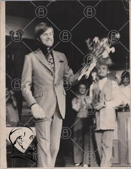 man, kostym, blommor, leende, scen, 1970-tal, fest, publik, kläder, svartvitt, stil, evenemang, artister, underhållning, frack, elegans, jubel, applåder, presentation, glädje, minnen, retro, tradition, socialt, festligheter, kultur, uttryck, charmerande, manlig, stilfull