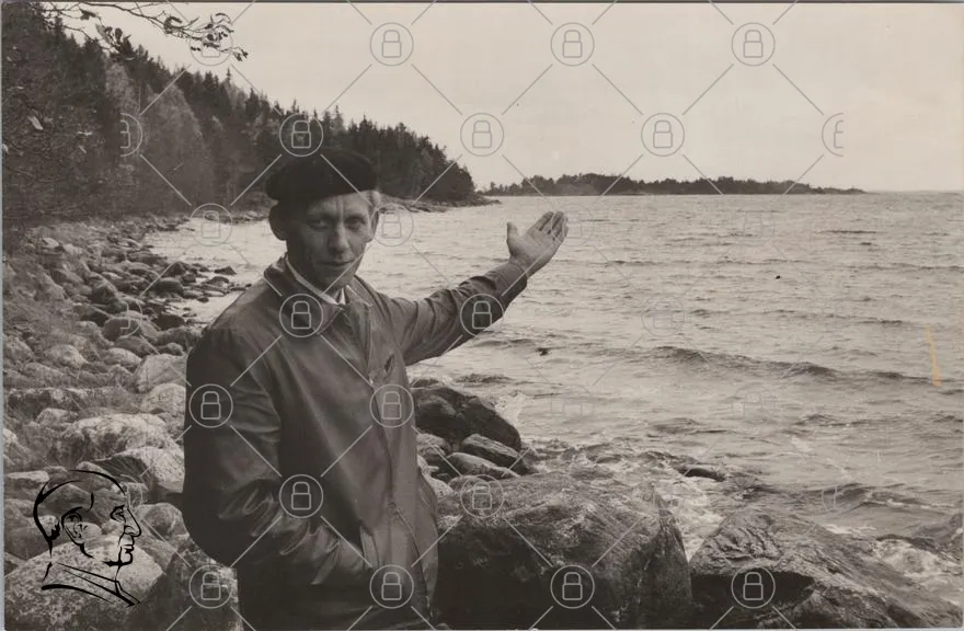 man, sjö, kust, träd, kläder, hand, gest, svartvitt, natur, landskap, sten, vatten, himmel, vy, fotografering, 1900-tal, retro, stillhet, skog, ö