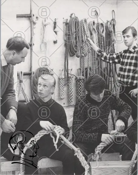 människor, rep, knutar, utbildning, svartvitt, 1960-tal, hantverk, samarbete, fokus, diskussion, kläder, tradition, teknik, lärande, grupp, interaktion, verkstad, praktiskt, instruktion, ungdomar, erfarenhet, arbete, kreativitet, miljö, handarbete, säkerhet, redskap, träning, kunskap