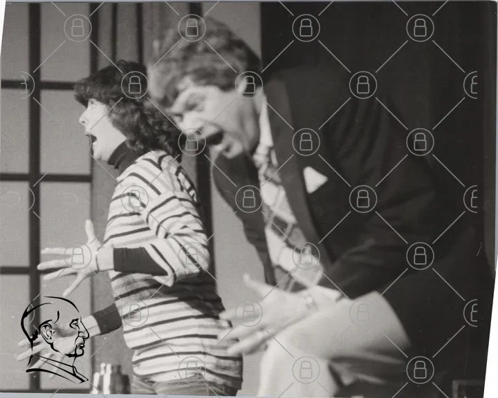 skådespelare, teater, svartvitt, känslor, gestikulation, scen, drama, uttryck, kostymer, publik, komedi, 1980-tal, man, kvinna, interaktion, improvisation, underhållning, skratt, spänning, performance, uttrycksfull, kroppsspråk, ansiktsuttryck, kläder, mikrofon, ljus, bakgrund, scenografi