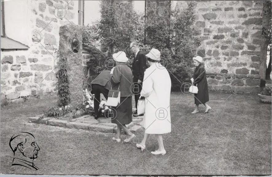 historisk, svartvit, människor, trädgård, blommor, sten, kläder, hattar, kvinnor, män, samling, minnesmärke, fotografering, utomhus, 1900-tal, tradition, besök, kultur, natur, monument