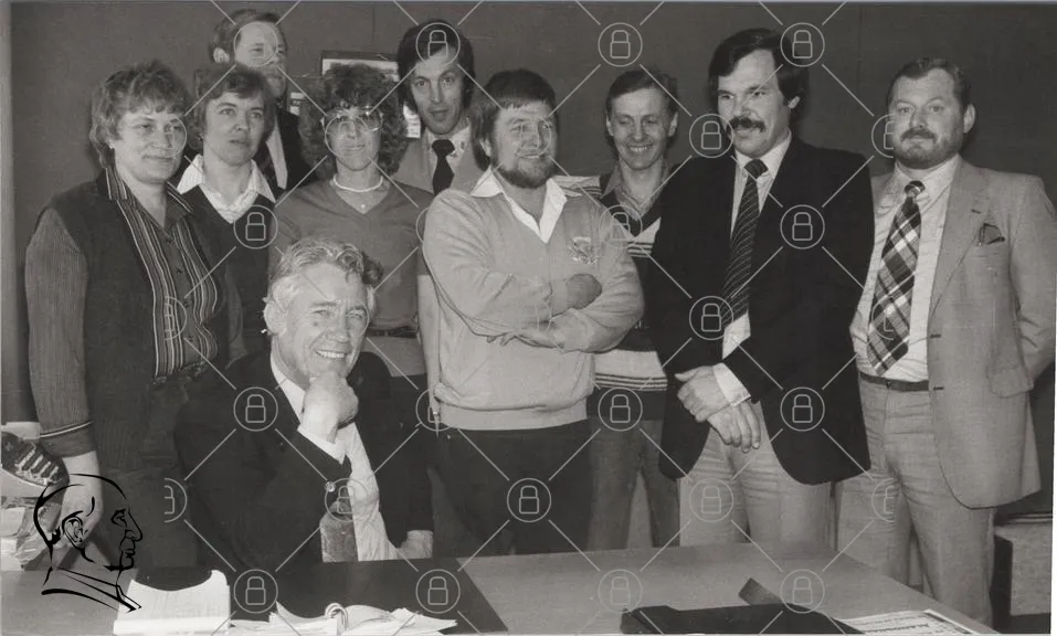 grupp, människor, svartvitt, kontor, kläder, 1980-tal, leende, professionell, samarbete, presentation, män, kvinnor, möte, team, affärsmän, fotografi, retro, stil, ansikten, diskussion, arbete, kollegor, minnen, historia, företag, samling, skratt, vänskap, professionell miljö, arbetsplats, gemenskap