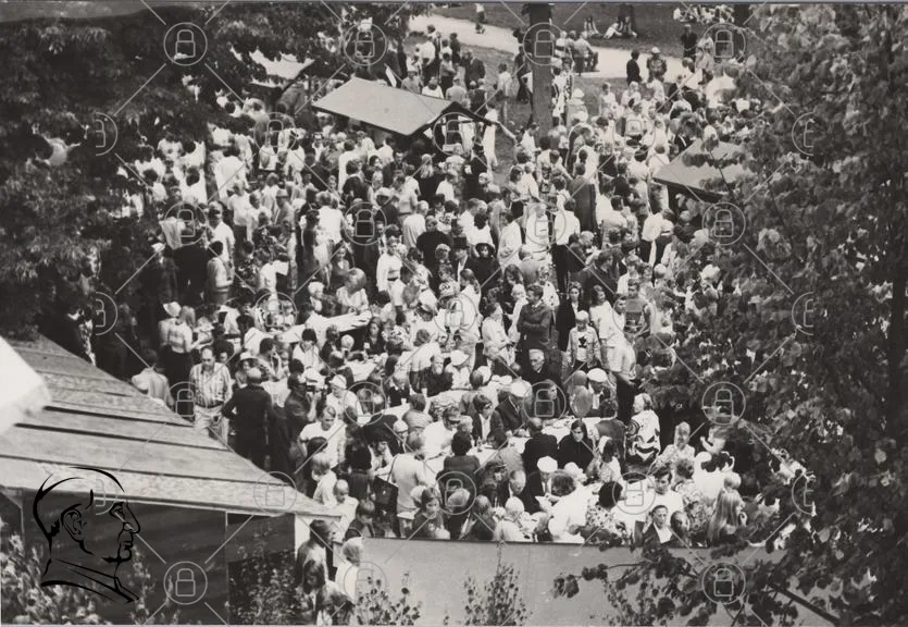 folkmassa, park, människor, evenemang, samling, utomhus, trä, bänkar, bord, fest, svartvitt, aktivitet, socialt, sommar, glädje, tradition, kultur, festligheter, gemenskap, natur, träd, kläder, leenden, barn, vuxna, mat, dryck, underhållning, fotografering