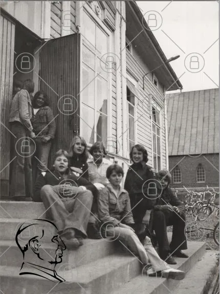 barn, ungdomar, grupp, utomhus, trappa, byggnad, svartvitt, cyklar, leende, kläder, 1980-tal, vänskap, skola, fotografering, pojkar, flickor, sommar, gemenskap, minnen, nostalgi