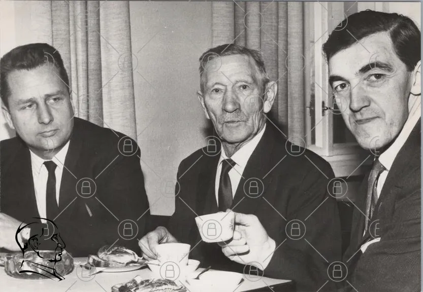 tre män, bord, kaffe, smörgås, kostym, slips, svartvitt, gammal bild, möte, diskussion, 1900-tal, inomhus, fönster, kläder, ansiktsuttryck, äldre man, yngre man, traditionell, socialt sammanhang, retro, historisk, samvaro, mat, dryck, fotografi, nostalgi, kultur, tidsepok, interaktion
