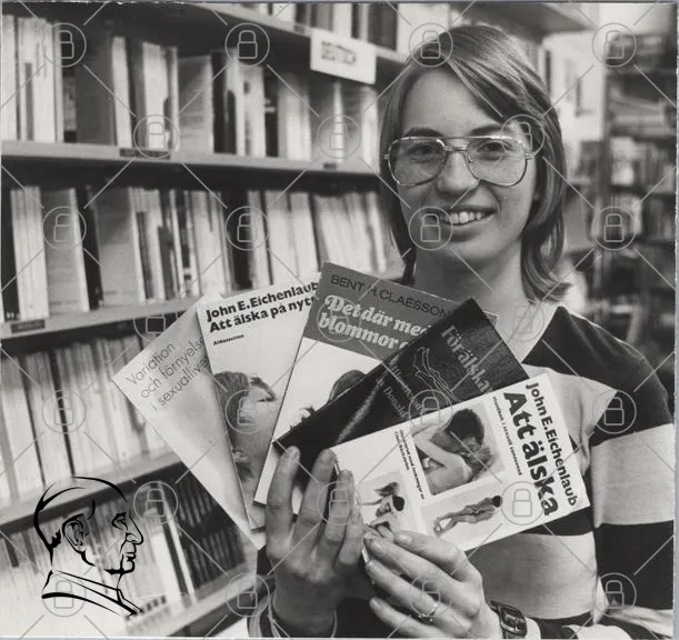 bok, bibliotek, kvinna, glasögon, böcker, svartvitt, läsning, författare, litteratur, information, utbildning, kunskap, kultur, samhälle, intellekt, studier, ungdom, intresse, hobby, inspiration, text, omslag, tryck, fotografi, porträtt, 1970-tal, retro, vintage, forskning, samtal, relationer