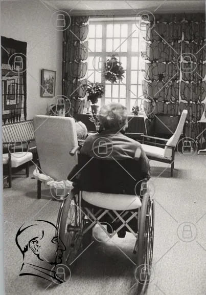 äldre, rullstol, inomhus, vardagsrum, möbler, fönster, gardiner, svartvit, person, sittande, hem, komfort, interiör, väggkonst, golv, stolar, ljus, rum, samhälle, livsstil