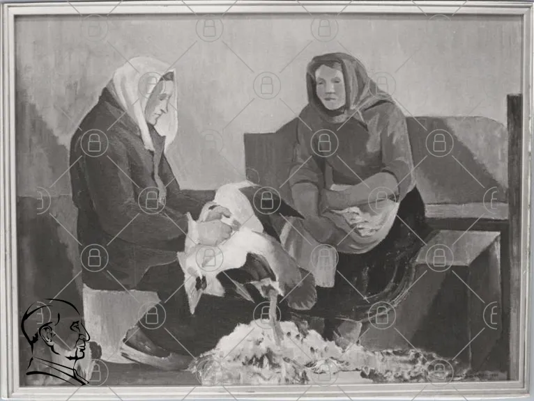 kvinnor, fåglar, arbete, tradition, landsbygd, svartvitt, porträtt, handarbete, kläder, natur, djur, kultur, historia, samarbete, rural, konst, sittande, stämning, gammaldags, höns, fågelhållning, hem, familj, gemenskap, livsstil, skådespel, uttryck, känslor, miljö, detaljer