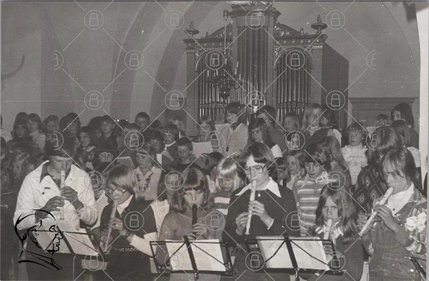 konsert, barn, musik, flöjt, orkester, uppträdande, publik, kyrka, gammal bild, instrument, sång, skolbarn, samling, tradition, evenemang, kläder, 1970-tal, ungdomar, scen, notblad, gemenskap