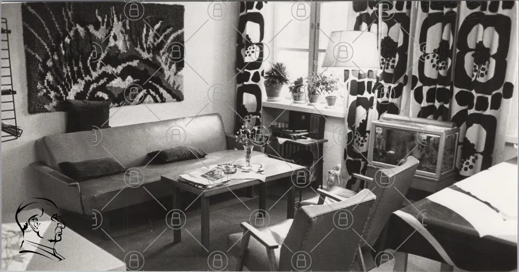 inredning, vardagsrum, svartvit, soffa, bord, böcker, växter, lampa, gardiner, konstverk, tidningar, retro, möbler, heminredning, stil, 1960-tal, minimalistisk, komfort, hemtrevligt, atmosfär
