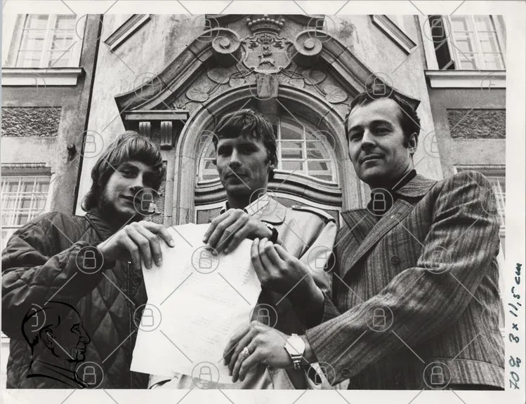 tre män, dokument, byggnad, svartvitt, 1970-tal, kläder, ansiktsuttryck, samarbete, historia, fotografi, arkitektur, stil, gruppbild, utomhus, text, papper, signatur, kultur, tradition, minnen, nostalgi
