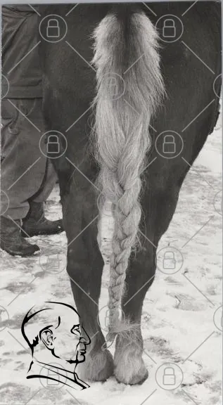 häst, fläta, svans, svart, vit, snö, vinter, jordbruk, djur, människa, kläder, tradition, landskap, natur, fotografering, svartvitt, bondgård, hästskötsel, rural, kultur