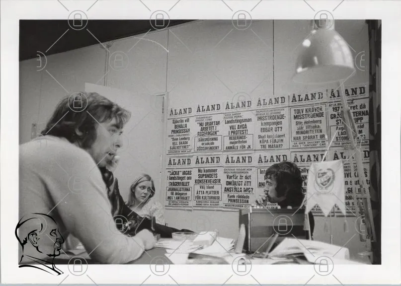 Åland, politik, protest, kampanj, affisch, 1970-tal, människor, diskussion, information, tidningar, möte, historia, samhälle, aktivism, debatt, kultur, svartvitt, dokumentation, medborgare, engagemang, frågor, opinionsbildning, representation, lokal, medie, kommunikation, arrangemang, evenemang, folkrörelse, samhällsfrågor