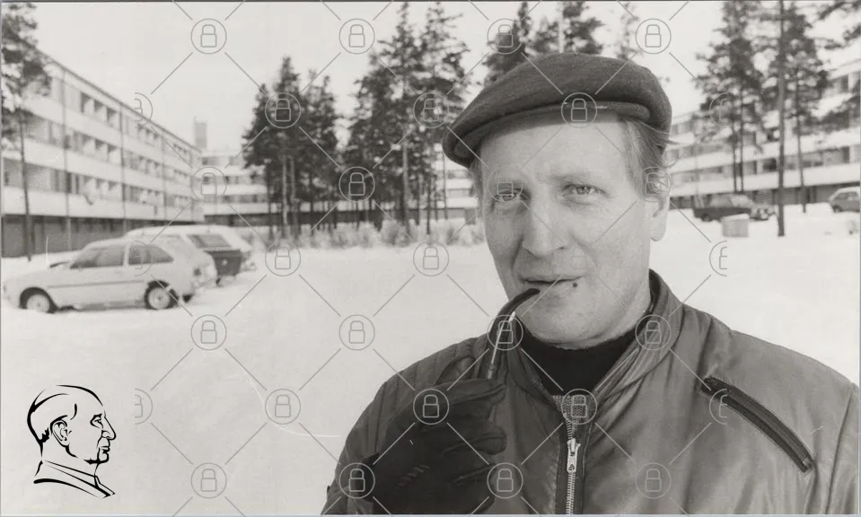 man, hatt, rök, vinter, snö, byggnader, parkering, svartvitt, kläder, leende, hand, munstycke, kallt, träd, asfalt, stil, ansikte, uttryck, fotografi, retro, 1900-tal, miljö, utomhus, person, skägg, gest, rör, avstånd, landskap