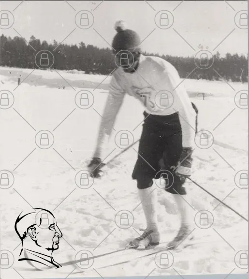 skidåkning, vinter, snö, sport, man, gammal bild, svartvitt, skidutrustning, träskidor, kallt, friluftsliv, skidhjälm, skidkläder, natur, skog, aktivitet, tradition, historisk, motion, balans, tävling