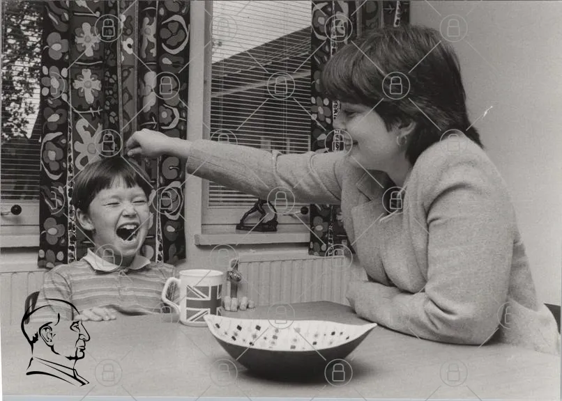 barn, skratt, kvinna, kök, mugg, brittisk flagga, bord, skål, fönster, inredning, svartvitt, leende, familj, interaktion, 1980-tal, humor, glädje, vardag, relation, lekfullhet