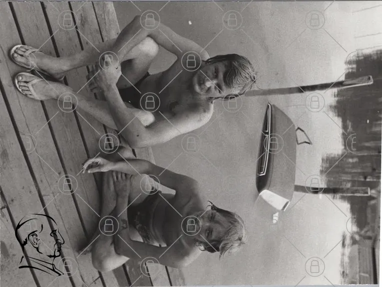 bad, pojkar, simma, trä, båt, vatten, sommar, svartvit, avslappnad, strand, shorts, ungdomar, vänskap, natur, reflektion, sol, lek, fritid, glädje, familj, minnen