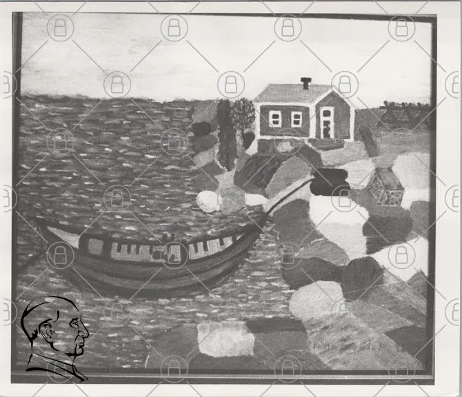 båt, hus, vatten, strand, klippor, träd, landskap, svartvitt, konst, natur, himmel, reflektion, stenar, sjö, vy, stillhet, måleri, kust, sommar, perspektiv, detaljer, struktur, minimalistisk, lugn, traditionell, skandinavisk, enkelhet, harmonisk, komposition, kreativitet