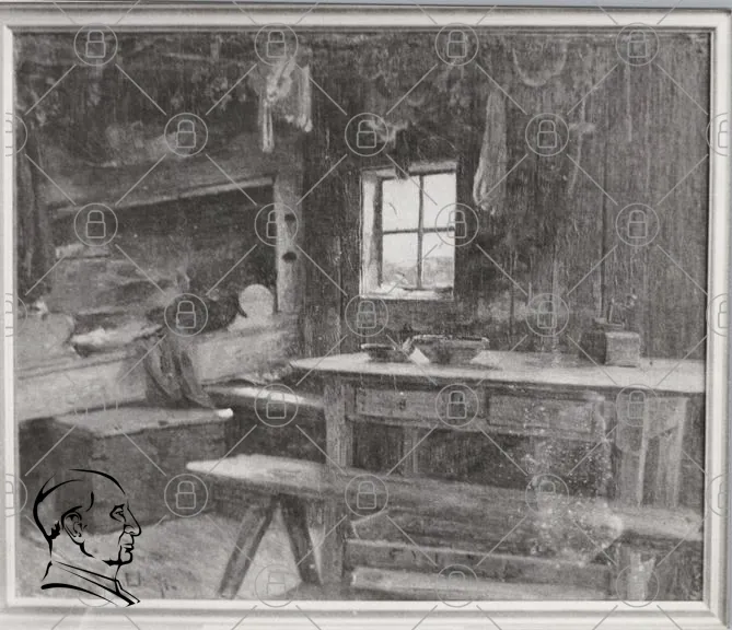 kök, fönster, bord, bänkar, kista, väggar, trä, inredning, skålar, ljus, gammal, rustik, landsbygd, möbler, hantverk, detaljer, hemtrevligt, atmosfär, svartvitt, konst