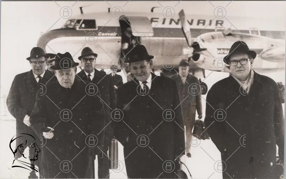 Finnair, flygplan, män, kostymer, hattar, snö, 1960-tal, resande, bagage, flygplats, historia, svartvitt, Convair, ankomst, affärsmän, vinter, kläder, grupp, professionell, transport, flygning, passagerare, stil, tradition, möten, utland, säkerhet, flygning, flygplansmodell