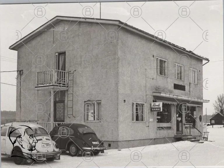 hus, byggnad, snö, vinter, bil, Volkswagen, gammal, svartvitt, fönster, balkong, skylt, bank, gata, landsbygd, arkitektur, 1900-tal, historisk, landskap, trappa, tak, väg, fordon, kommun, Sverige, retro, stil, foto, bild, panorama