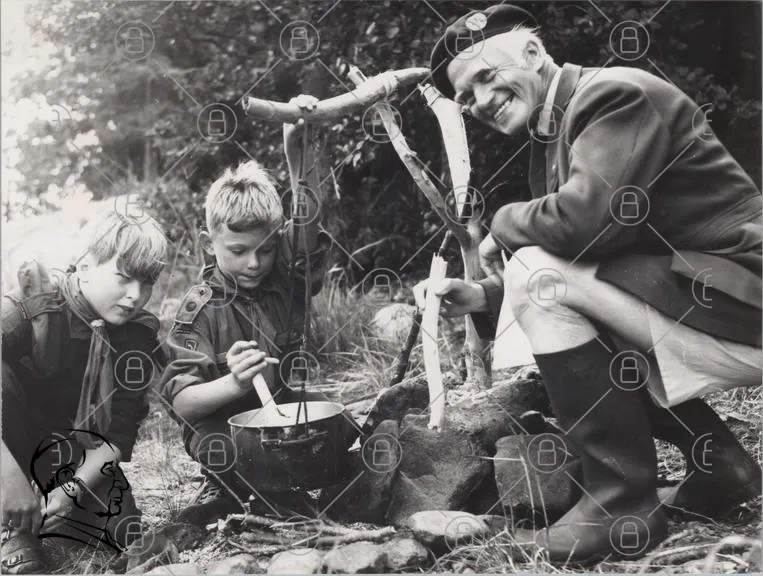 barn, läger, matlagning, utomhus, scout, natur, kastrull, eld, trä, leende, pojkar, vuxen, kläder, svartvitt, aktivitet, gemenskap, tradition, friluftsliv, camping, handarbete