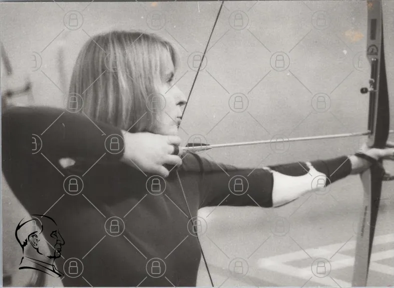 skytte, bågskytte, kvinna, svartvitt, sport, fokus, pil, båge, träning, precision, mål, arm, hand, koncentration, 1970-tal, retro, aktivitet, utomhus, tävling, teknik, idrott