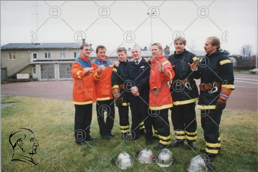 brandmän, uniformer, hjälmar, gruppfoto, brandstation, säkerhet, teamwork, professionella, leende, brandutrustning, gräs, byggnader, män, brandkår, gemenskap, samarbete, yrkesliv, brandbekämpning, tradition, utbildning, kamratskap, service, ansvar, ledarskap, stöd, gemensamma mål, brandförebyggande, insats, räddningstjänst, samhälle