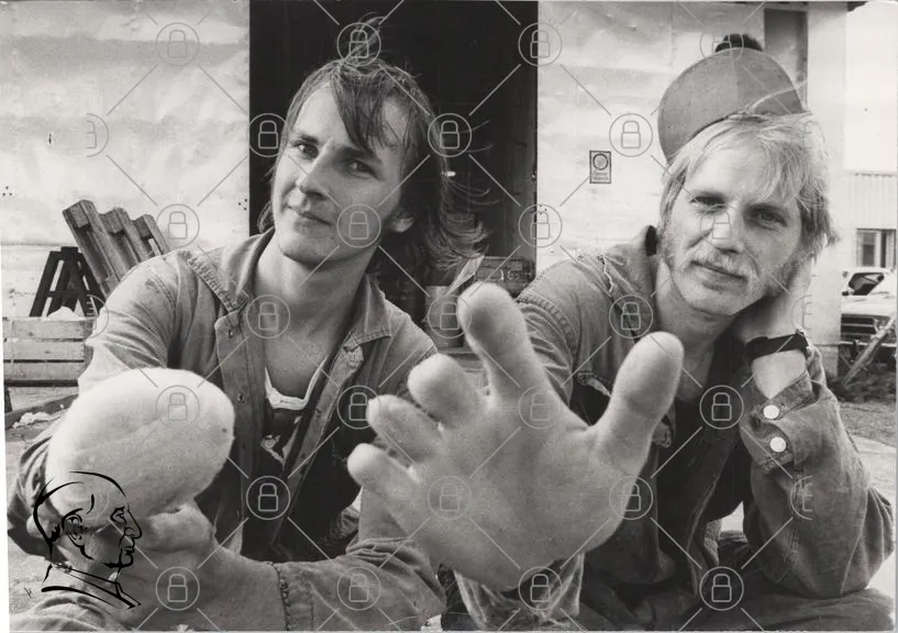 två män, svartvitt, porträtt, leende, kläder, jeans, arbete, 1970-tal, mustasch, hår, gest, vänskap, avslappnad, bakgrund, byggnad, utomhus, fotografi, nostalgi, ungdom, uttryck, kultur, historia, casual, mänsklig, interaktion, ansikten, kroppsspråk, stil, retro, gemenskap