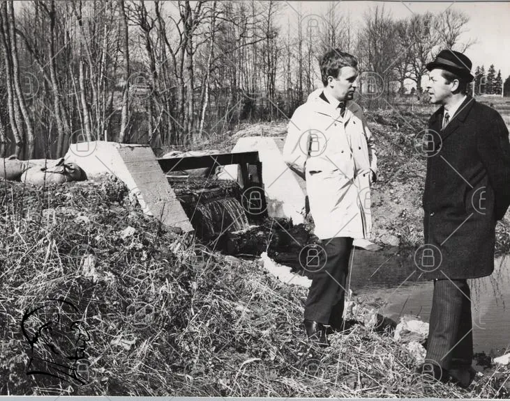 två män, diskussion, natur, träd, betongstruktur, vatten, flod, svartvitt, kläder, jacka, byxor, skor, landskap, utomhus, byggnad, teknik, miljö, forskning, ingenjör, projekt, 1960-tal, historisk, vattenflöde, grönska, skog, fotografi, retro, analys, observation