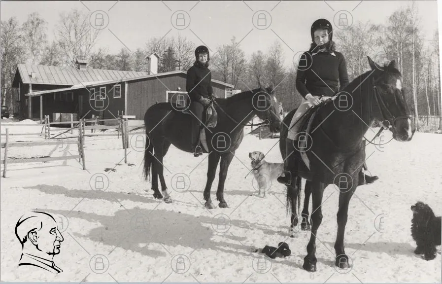 hästar, ridning, snö, kvinnor, hjälmar, stall, vinter, utomhus, natur, svartvitt, ridkläder, häst, sällskap, landskap, fritid, sport, djur, ridlektion, skog, gård