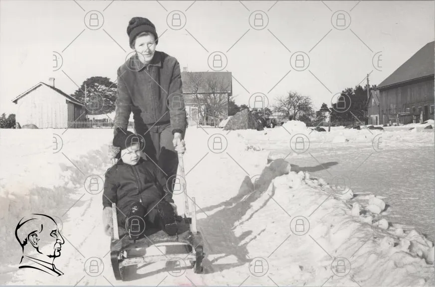 snö, vinter, barn, kälke, förälder, utomhus, svartvitt, lek, familj, landskap, träd, snödrivor, kläder, hatt, glädje, promenad, tradition, nostalgi, barnlek, snöfall