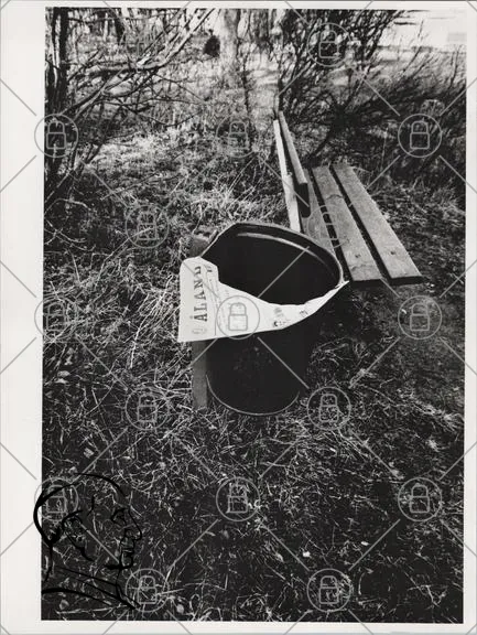sopkorg, bänk, gräs, natur, svartvitt, avfall, utomhus, landskap, stillhet, miljö, Åland, skräp, park, trä, sommar, lugn, avskildhet, enkelhet, fotografi, konst, dokumentär, stillbild, övergiven, gammal, rustik, landsbygden, skugga, text, skylt, avfallshantering