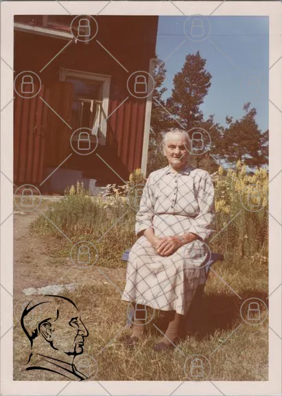 gammal kvinna, sittande, röd stuga, trädgård, blommor, grönska, klänning, soligt, landskap, natur, fönster, gammaldags, svensk, traditionell, sommar, utomhus, leende, avkoppling, vintage, fotografi