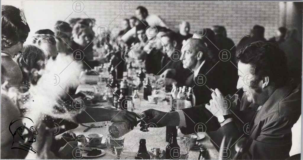 middag, fest, människor, bord, drycker, flaskor, glas, samtal, svartvitt, gemenskap, mat, tradition, firande, kultur, samvaro, leenden, kläder, dekoration, servetter, tallrikar, kaffe, te, skålar, uppvaktning, högtid, socialt, samling, historia, minnen, njutning