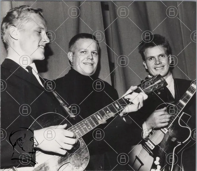 musiker, gitarr, svartvitt, 1960-tal, band, uppträdande, kläder, manliga, leende, scen, musik, instrument, fotografi, retro, stil, underhållning, kultur, vänskap, samarbete, nostalgi, artister
