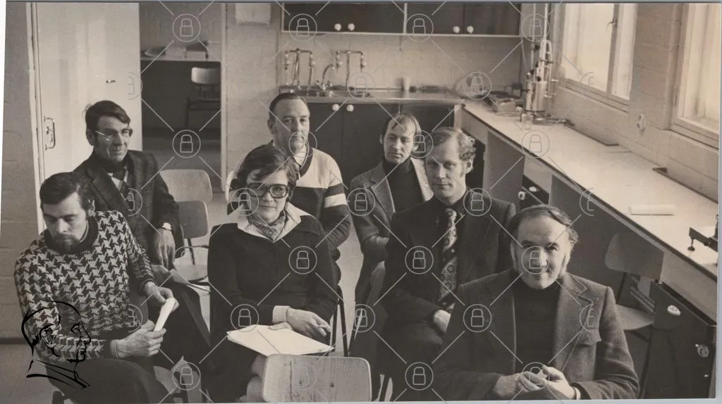 grupp, människor, 1970-tal, kontor, forskning, laboratoriemiljö, kläder, möte, svartvitt, sittande, bord, stolar, vetenskap, teknik, professionell, diskussion, utbildning, akademisk, studenter, presentation