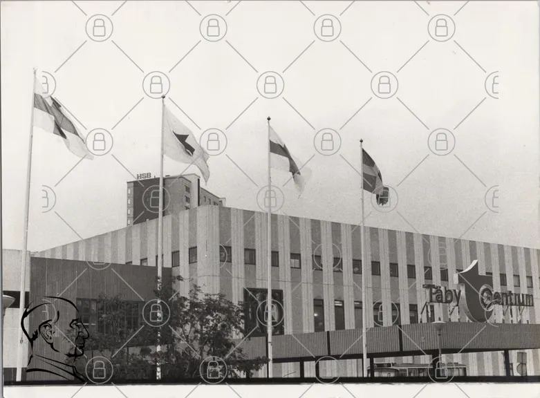 Taby, byggnad, flaggor, HSB, svartvit, arkitektur, stad, Sverige, kontor, träd, himmel, modern, design, kommun, centrum, skylt, urban, landskap, historia, fotografering