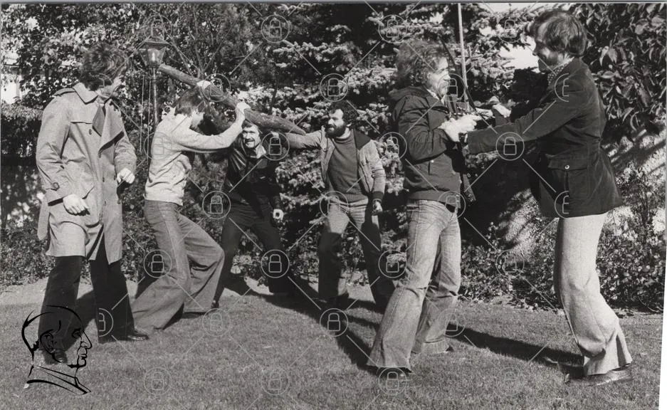 människor, utomhus, trä, kamp, skratt, 1970-tal, svartvitt, träd, gräs, kläder, samarbete, lek, humor, vänner, action, energi, grupp, manliga, interaktion, rolig, situation, natur, sport, aktivitet, gemenskap, uttryck, rörelse, dynamik, kreativitet, fotografering