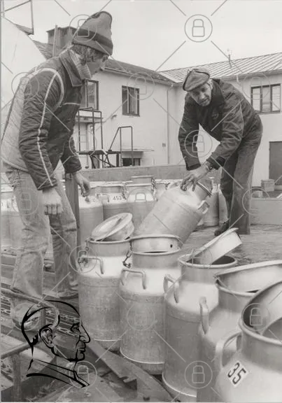 mjölk, mjölkkrukor, lantbruk, män, arbete, gammal, svartvitt, tradition, landsbygd, gård, behållare, mjölkproduktion, 1970-tal, jordbruk, samarbete, utomhus, lastbil, hantverk, historia, rural, bönder, mjölktransport, metall, behållare, gårdsliv, mänsklig aktivitet, vintage, kultur, natur