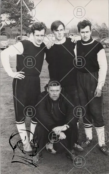 fotbollsspelare, lag, svartvitt, träning, sport, 1960-tal, manliga, fotboll, utomhus, gruppbild, tränare, idrott, klassisk, retro, uniform, samarbete, leenden, fotbollsdräkt, gräs, gemenskap, nostalgi, motion, tävling, prestation, laganda, tradition, kamratskap, fotbollsplan, sportkläder, manlig gemenskap