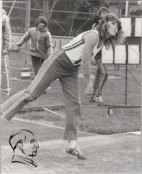 sport, kvinna, kast, träning, atlet, 1970-tal, svartvitt, idrott, tävling, gymnastik, utomhus, motion, stil, fokus, teknik, ungdom, sportkläder, bana, precision, styrka