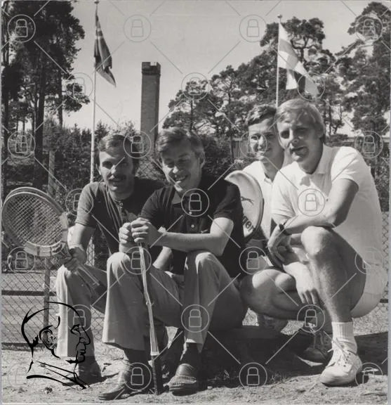 tennis, spelare, män, sport, trä, flaggor, svartvitt, utomhus, sommar, aktivitet, leende, racket, shorts, t-shirt, vänskap, natur, bakgrund, monument, tävling, fritid, 1970-tal, gruppfoto, tradition, motion, gemenskap, glädje, landskap, idrott, avslappnad, samvaro