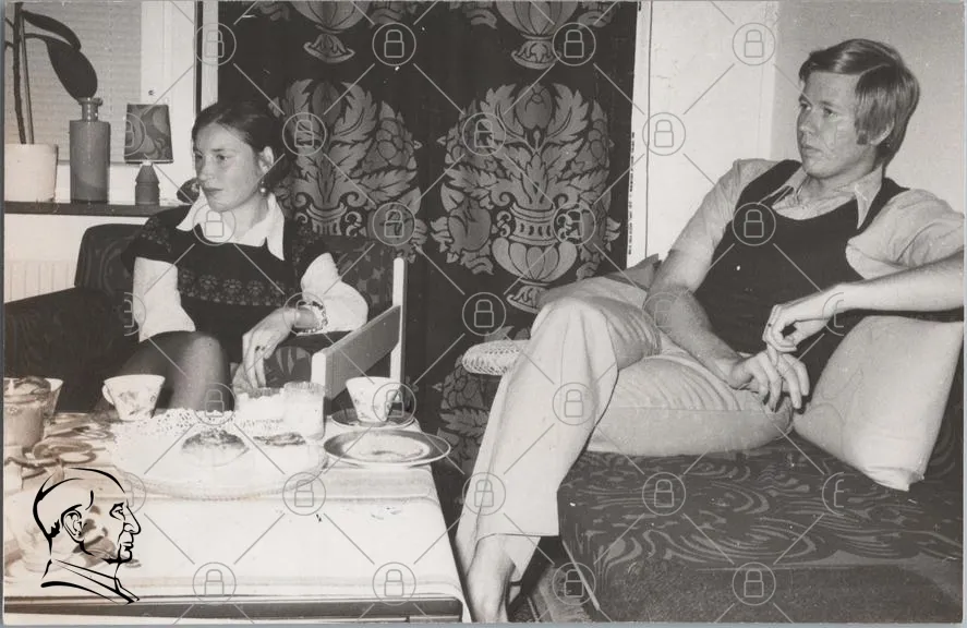svartvitt, foto, människor, kvinna, man, inomhus, möbler, bord, kakor, glas, gardin, 1970-tal, kläder, sittande, samtal, retro, stil, heminredning, sällskap, avslappnad, interiör