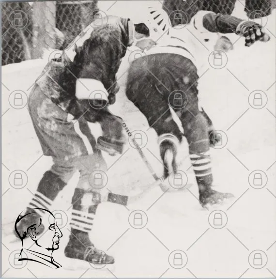 ishockey, snö, spelare, puck, skridskor, sport, tävling, lag, vinter, utomhus, mål, träning, match, utrustning, hockeyklubba, snöfall, svartvitt, 1900-tal, idrott, fysisk aktivitet, laganda, skott, defensiv, offensiv, åkning, taktik, strategi, publik, arena, tradition